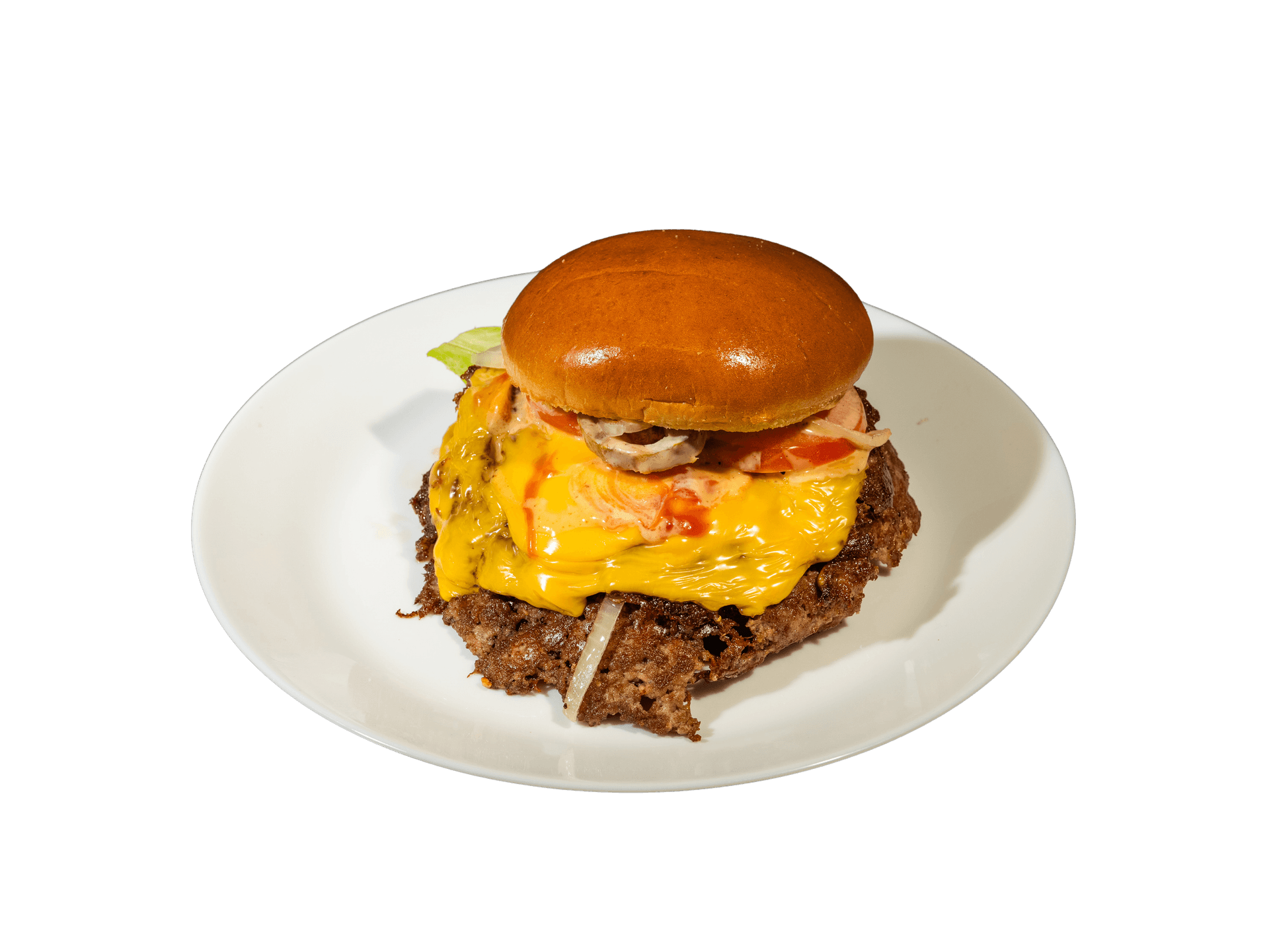 Two smashed beef patties with melted cheese and toppings of your choice.